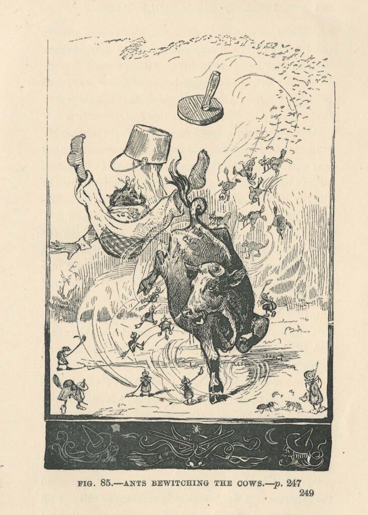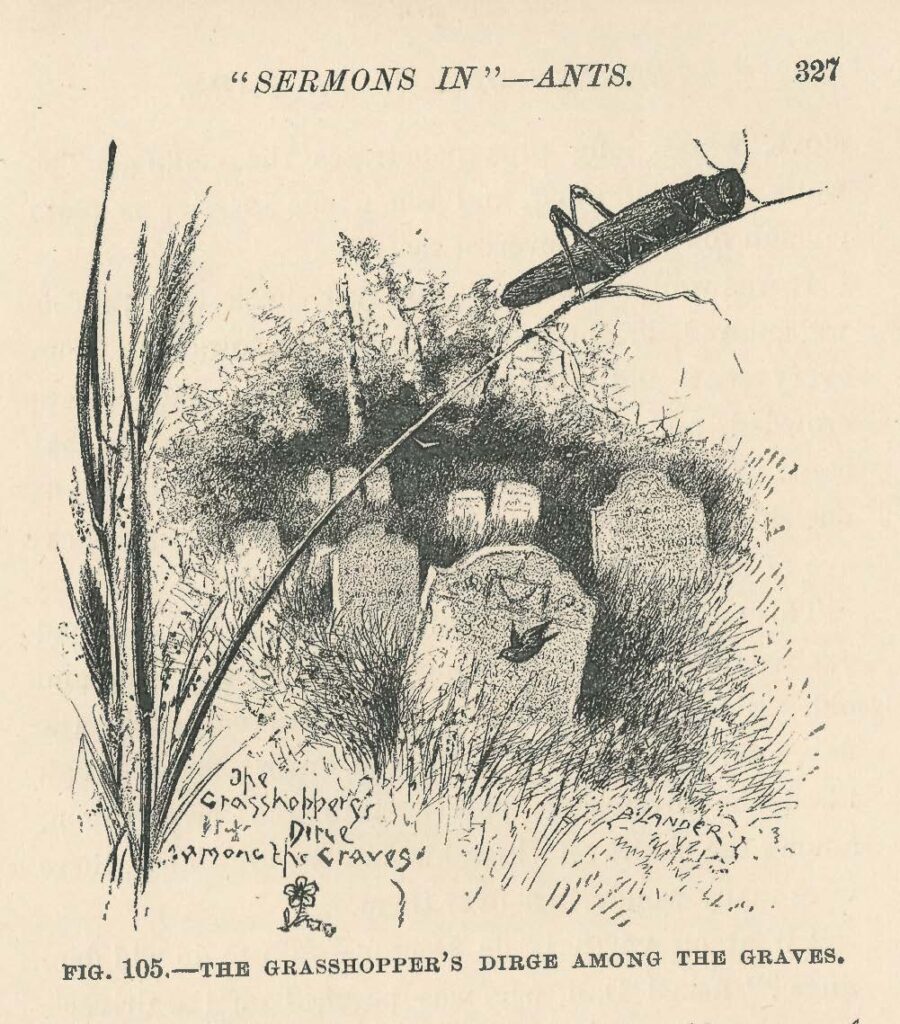 … and, finally, these two somewhat perplexing images (which make perfect sense in narrative context) of “Ants Bewitching the Cows” and “The Grasshopper’s Dirge Among the Graves:”