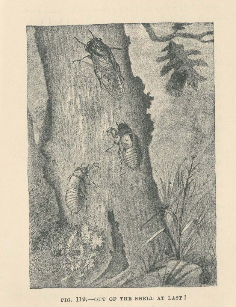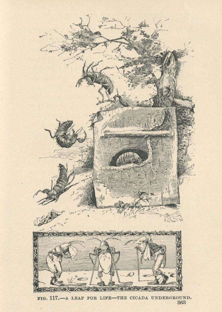 The book’s illustrations are detailed and often amusing. Look at these images showing the life-cycle of the cicada: